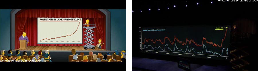 Lisa organiza una charla titulada «Una verdad exasperante» para intentar concienciar al pueblo sobre los peligros de la contaminación del Lago Springfield y presenta las gráficas subida a una plataforma elevadora tal y como lo hacía Al Gore en el documental «Una verdad incómoda» mientras intentaba concienciar al mundo de los peligros del cambio climático. ![]()
