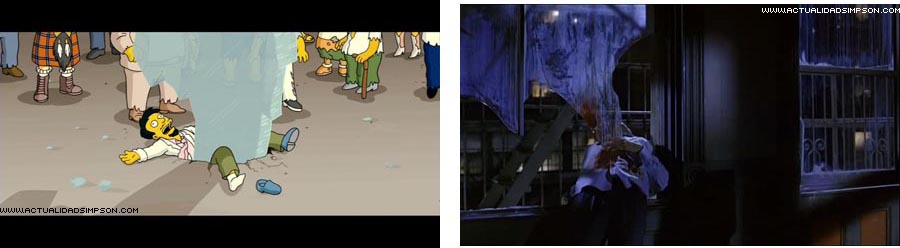 Al final de la película, justo cuando el jefe Wiggum dice «Es asombroso que no haya heridos», cae del cielo un trozo de cristal bastante grande que aplasta al Dr. Nick Riviera. Si lo miráis bien, el cristal tiene una forma muy parecida al cristal que mataba a Carl Bruner (Tony Goldwyn) al final de «Ghost». Sí, ésta es un poco rebuscada… ![]()