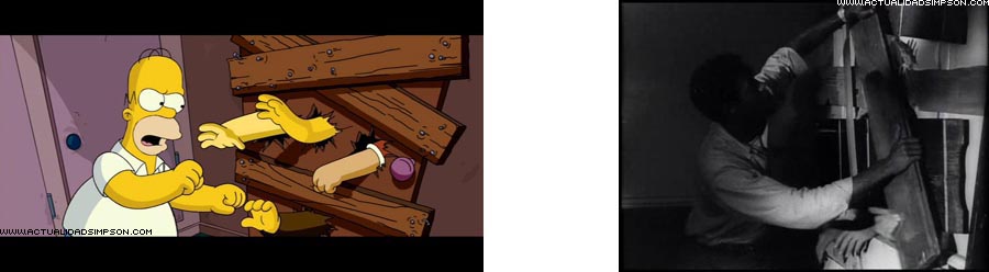 Para evitar que la muchedumbre enfurecida entre en casa, Homer bloquea la puerta con tablas, pero aún así los furiosos vecinos consiguen introducir sus brazos entre las tablas de la misma forma que lo hacían los peligrosos zombis de «La noche de los muertos vivientes».