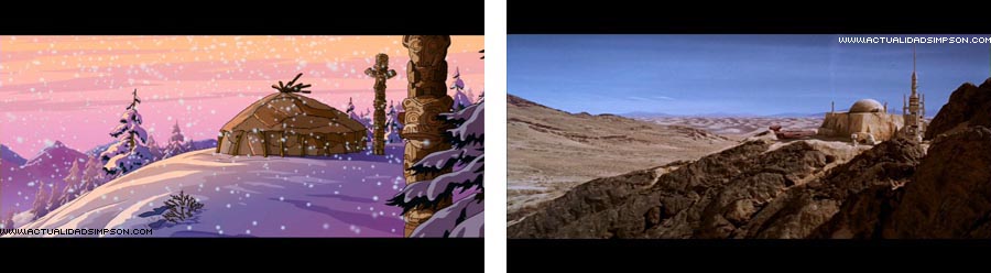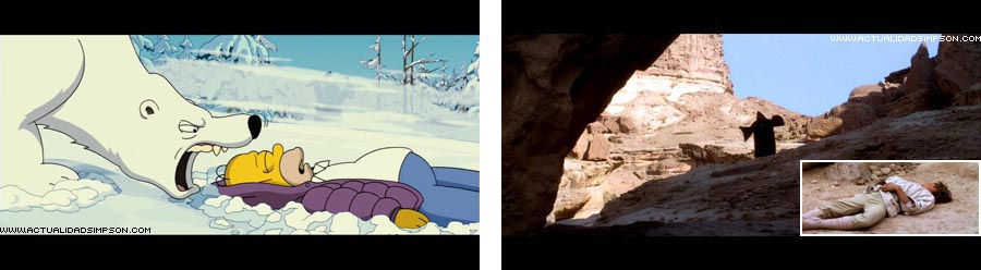 La forma en que «Doña Pechugona» encuentra a Homer y el lugar al que se lo lleva recuerda mucho al primer encuentro entre Luke Skywalker y Obi-Wan Kenobi en «La guerra de las galaxias». En «Los Simpson: la película», Homer está tirado en el suelo inconsciente y un oso está a punto de atacarle cuando en el horizonte aparece la mujer esquimal gritando y levantando los brazos para espantarlo. En «La guerra de las galaxias», Luke Skywalker está tirado en el suelo inconsciente mientras varios Tusken registran su nave, pero justo en ese momento aparece en el horizonte Obi-Wan Kenobi vestido con una túnica y consigue alejar el peligro levantando los brazos y gritando.