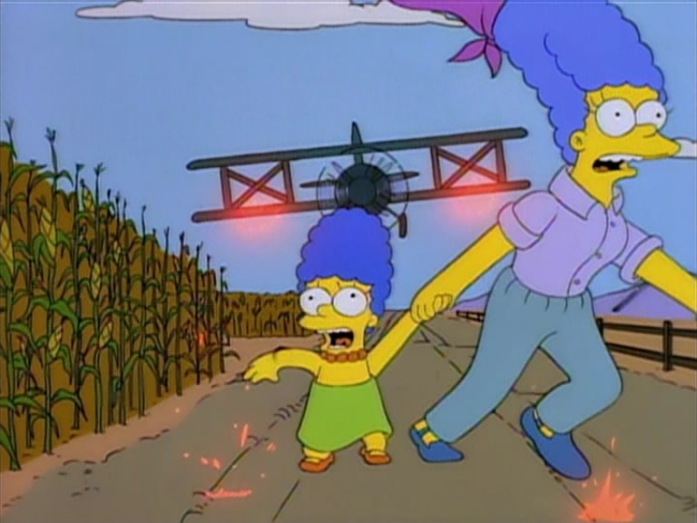 Entre los flashbacks traumáticos de Marge con los aviones, vemos un momento en el que estaba con su madre junto a un campo de maíz y ambas huían del ataque de un biplano, un homenaje a la famosa escena de «Con la muerte en los talones» en la que Roger (Cary Grant) huía de un ataque del mismo tipo de avión también junto a un campo de maíz.