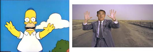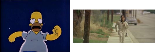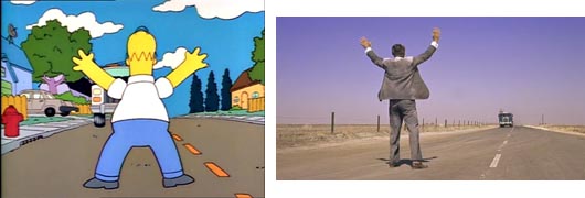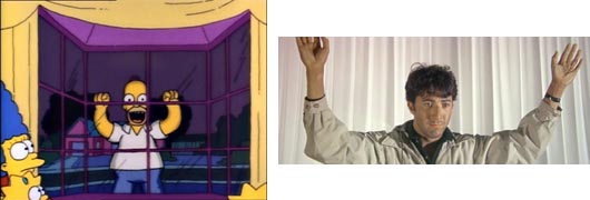 Una vez llega a casa, Homer golpea el ventanal desde fuera y grita el nombre de Marge. Lo mismo hace en la película Ben (Dustin Hoffman) cuando llega a la iglesia y comienza a gritar el nombre de Elaine con su cuerpo pegado a la cristalera.
