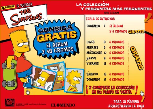 Panini va a lanzar una nueva colección de cromos de Los Simpson en España. Su nombre es «Manual de supervivencia en el colegio» y consistirá en un álbum de 64 páginas con un total de 228 cromos. Para su lanzamiento, Panini ha decidido colaborar con el diario El Mundo y mañana domingo día 7 de octubre, con la compra del diario recibiremos el álbum y un paquete de cromos totalmente gratis. Y durante toda la semana que viene el diario regalará un paquete de cromos cada día.