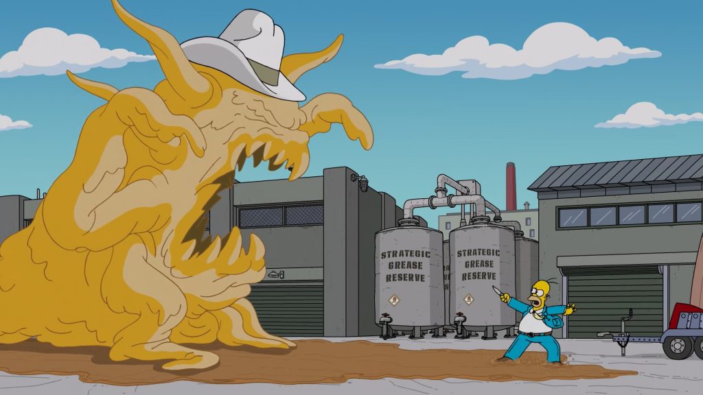 El primero de ellos, «The Last Days of Crisco», surgió a partir de una idea del guionista Jeff Westbrook, inspirada en un fenómeno real: los llamados fatbergs, enormes bloques de grasa y aceite que se acumulan en los sistemas de alcantarillado de las grandes ciudades. “Pensamos: ¿y si eso cobrara vida?”, explicó Price. A partir de ahí, Selman recordó una escena de la versión de «El terror no tiene forma» (The Blob, 1988), donde una criatura surge del fregadero y mata a un personaje. “Decidimos recrear algo parecido: el fatberg sale por el desagüe y arrastra a Wiggum”.