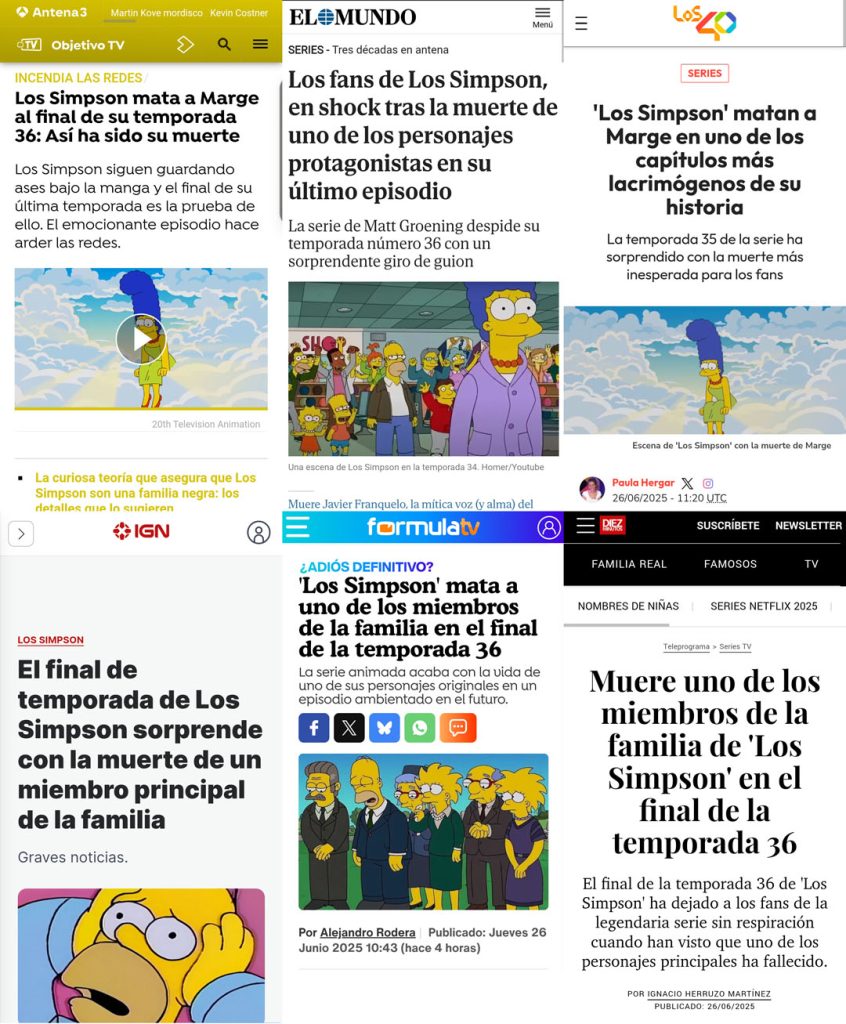 Durante los últimos días, numerosos medios han encendido las alarmas asegurando que Los Simpson ha matado a Marge en el episodio final de la temporada 36. Titulares como “La inesperada muerte de Marge Simpson conmociona a los fans” o “Los Simpson despiden a uno de sus personajes más icónicos” han circulado ampliamente en redes y portales de noticias. Pero, ¿qué hay de cierto en todo esto?