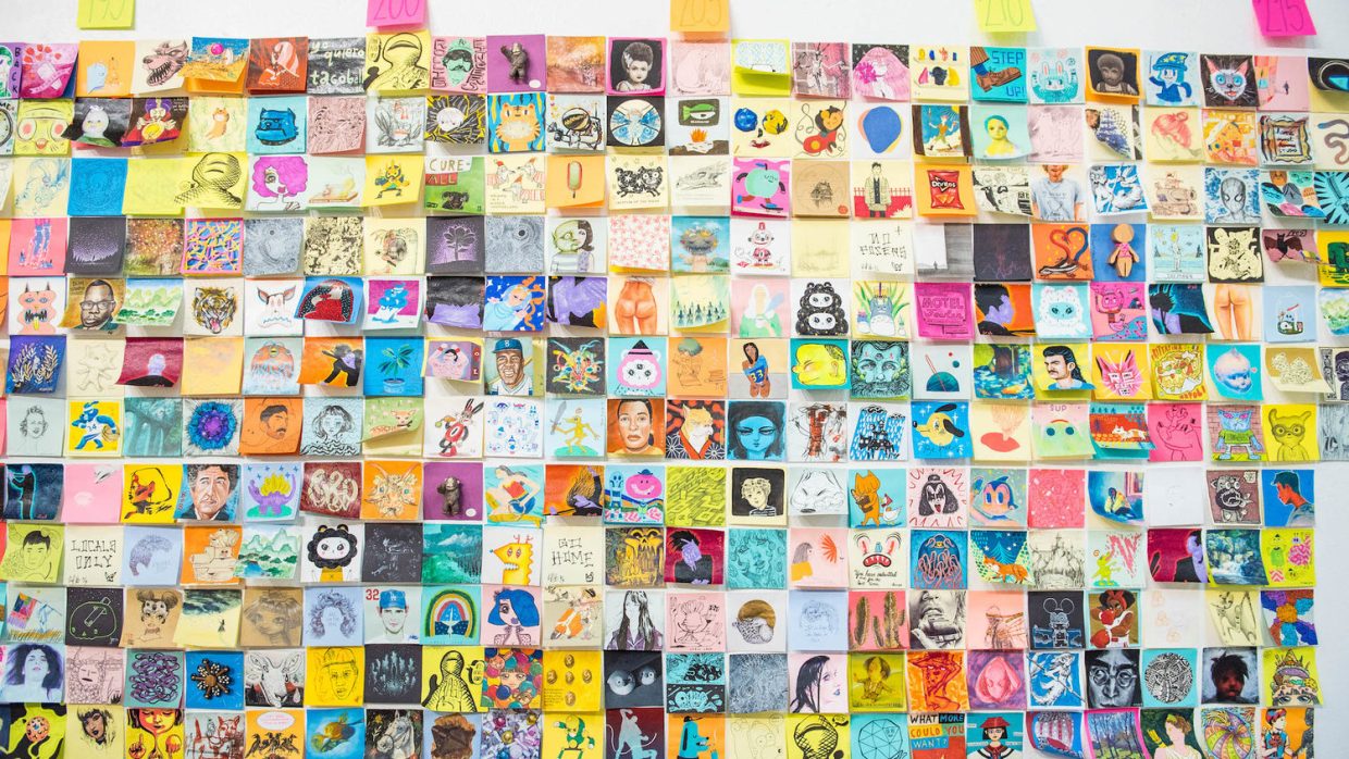 Desde hace 14 años, el curador de arte Eric Nakamura organiza en su galería Giant Robot de Los Ángeles una exposición de obras de arte en esas pequeñas hojas de papel autoadhesivo que todos conocemos como Post-it.